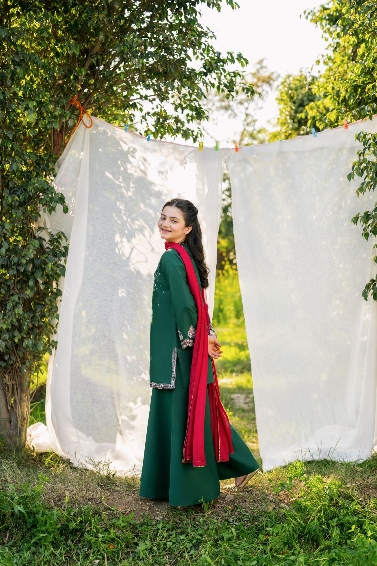 Forest Green – Embroidered Cotton Lawn 3-Piece Pakistani Dress for Girls | Triple