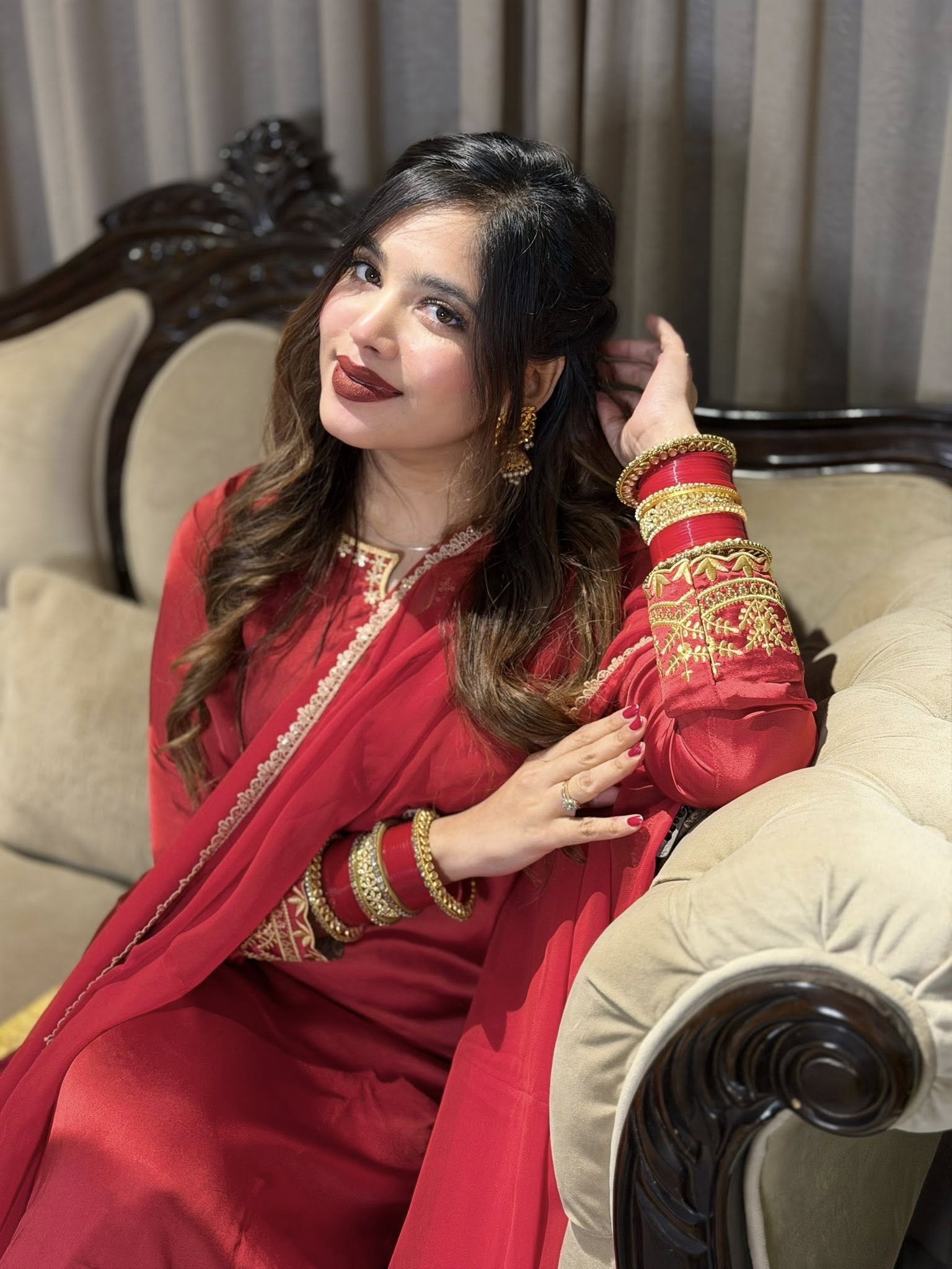 The matching red pant features coordinated embroidery at the hem, completing the look with balance and elegance. The weightless red dupatta, finished with a delicate border, adds softness and flow, making the outfit easy to carry throughout long wedding or festive events.